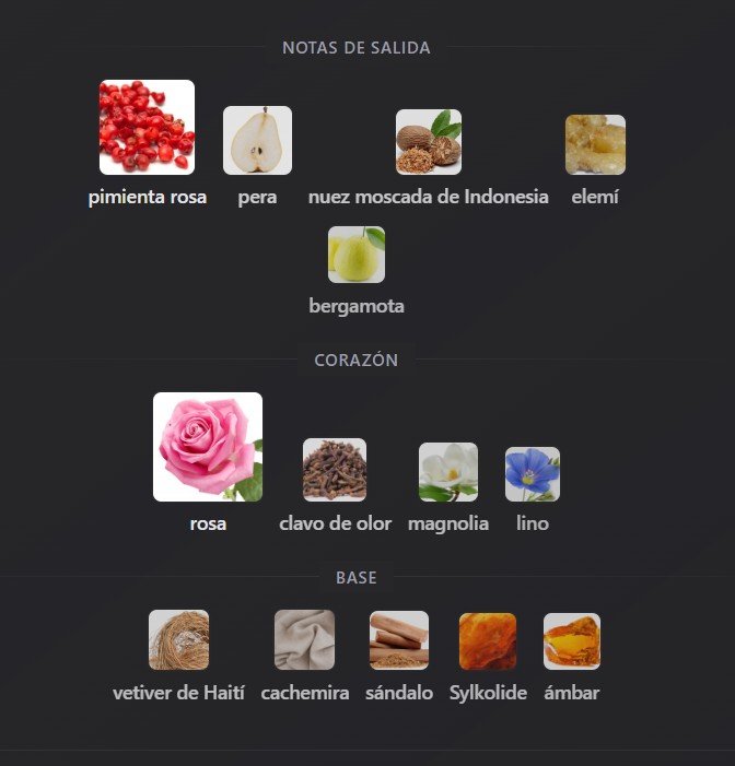 • Notas de salida: Bergamota, pera verde, pimienta rosa, nuez moscada