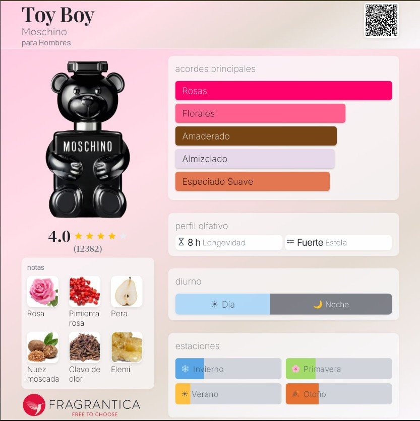 Moschino Toy Boy es una fragancia masculina atrevida y sofisticada que combina lo clásico con lo inesperado. Su protagonista es la rosa, que se mezcla con notas especiadas y amaderadas para crear un aroma seductor, moderno y lleno de personalidad.