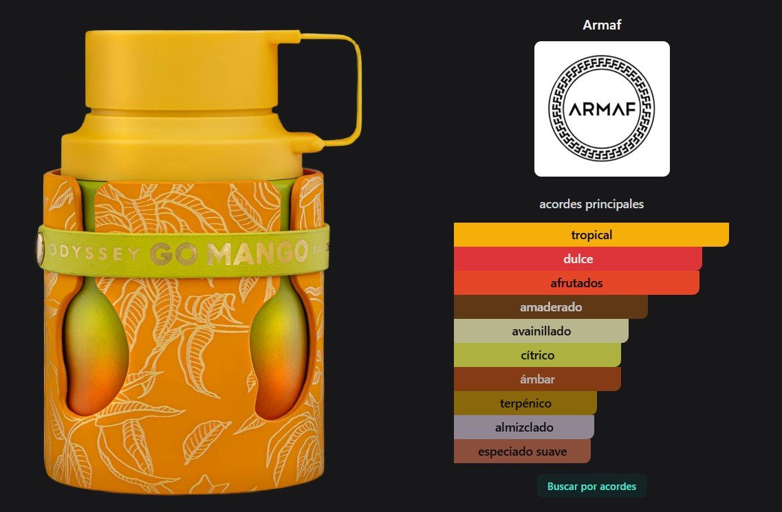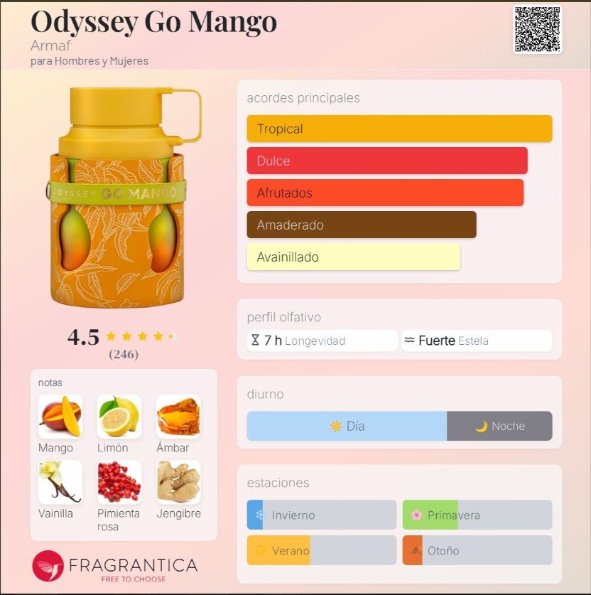 Odyssey Go Mango de Armaf es una fragancia unisex de la familia oriental floral tropical, pensada para quienes aman los aromas frutales con carácter. En la salida destacan notas ágiles de pimienta rosa (pink pepper), jengibre y limón, acompañadas por suaves flores blancas que aportan frescura y brillo. En el corazón se despliega la fruta protagonista: mango jugoso junto a tonka bean y maderas secas que lo redondean con textura y profundidad. La base cierra con una mezcla cálida de vainilla, ámbar, notas nuezadas, musk y guayaco, dejando una estela cremosa, dulce y envolvente.
