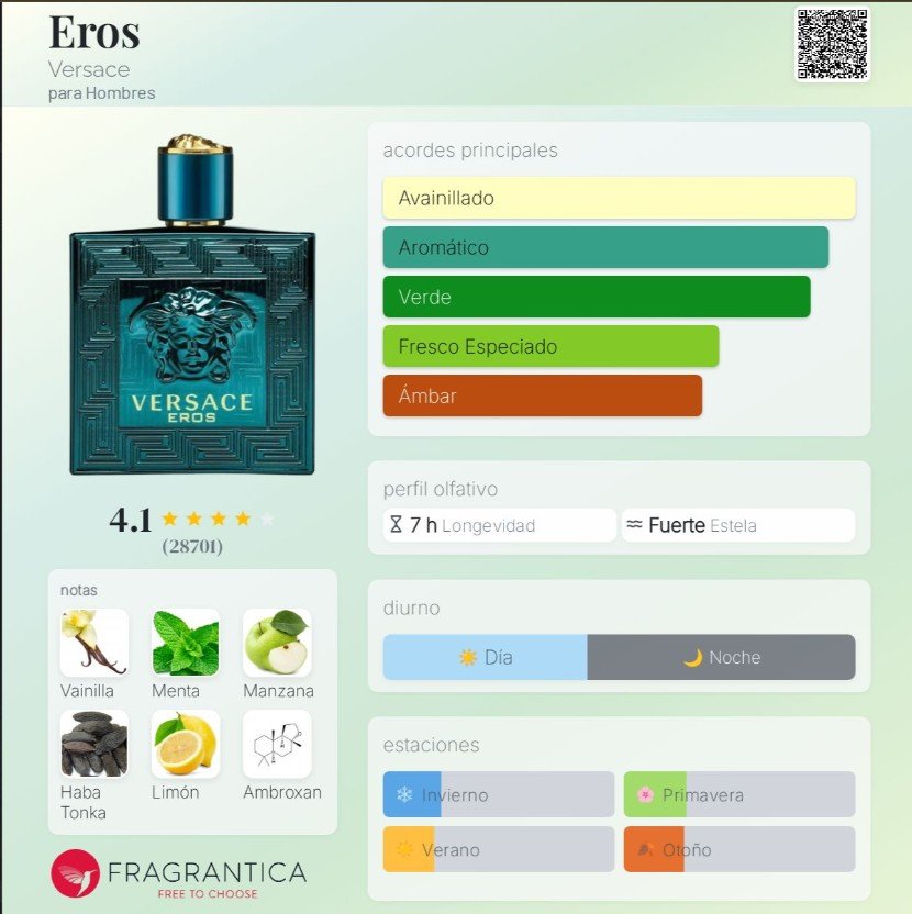 Versace Eros está diseñado para hombres seguros de sí mismos, que desean una fragancia con carácter, presencia y seducción. Es ideal para eventos por la noche, salidas especiales o momentos en que quieres dejar huella. Su mezcla fresca-dulce con fondo amaderado lo hace tan válido en climas templados como en estaciones más cálidas. Para quien busca proyectar poder, estilo y un aroma que atraiga miradas, Eros es una elección que no pasa desapercibida.